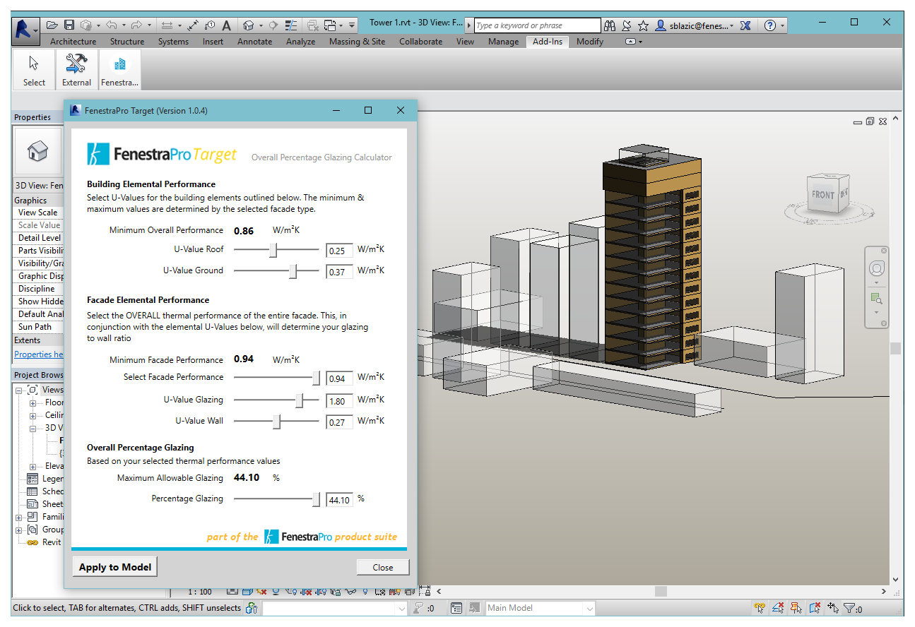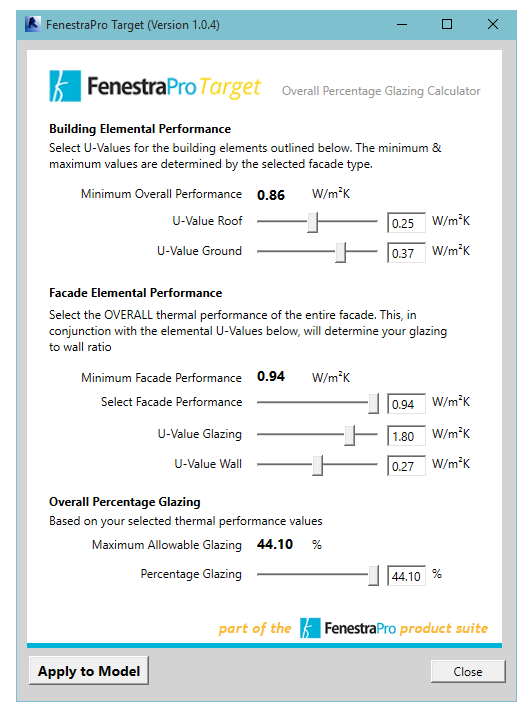 FenestraPro Target is early stage façade design tool for non-domestic buildings, to give guidance on Overall Percentage Glazing, based on the thermal considerations of a building. It is a part of FenestraPro Premium suite.